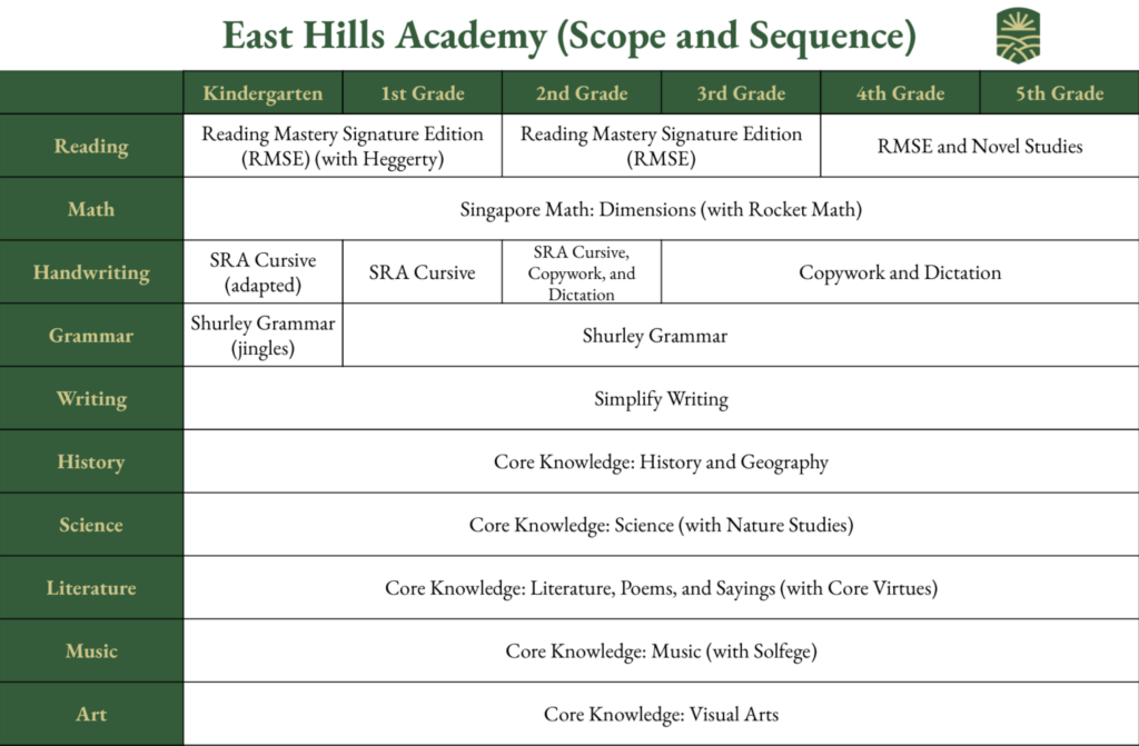 Each grade at East Hills Academy is a collection of (mostly) published programs that have been proven in scope and sequence and effectiveness. Below is an overview (with descriptions) of the curriculum we will be teaching in each grade.